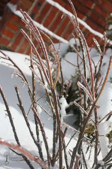 Last week in Cleveland, we had three days in a row over 50 degrees, and we almost hit 60 on one of them. The next day it went back down into the 20s or 30, and began to snow again. That much was expected. An ice storm and power outage the following day, however, were not expected. They certainly weren't welcome, either, especially with a sick husband and a sick toddler (which basically means two big babies to be taken care of). The storm was Sunday night/Monday morning, and I got out and shot these on Tuesday. The sun was out that day, so the ice glistened beautifully, but also started melting. It also snowed again on Monday night, so there is snow sitting on top of the ice, which was also very pretty.